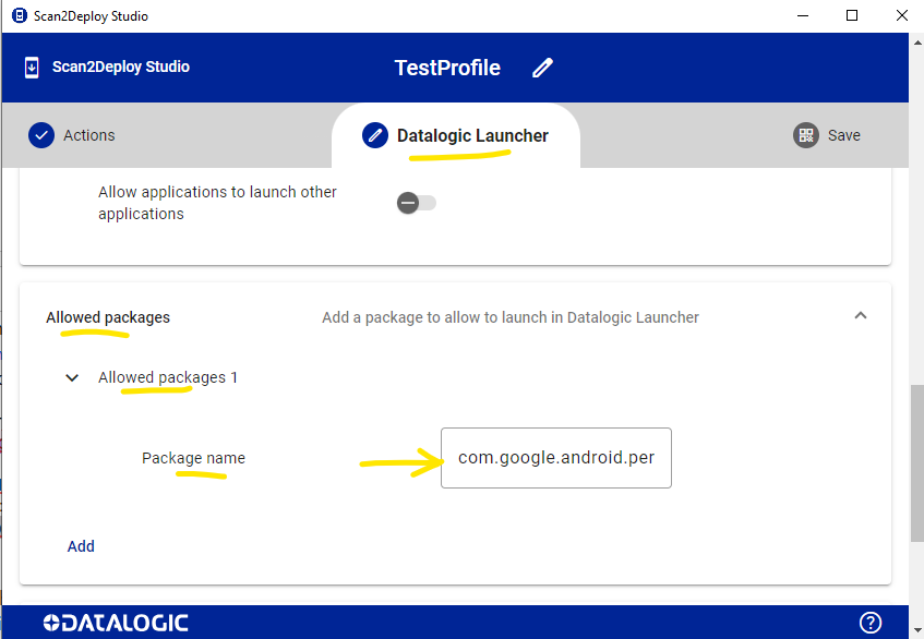 Open the Datalogic Launcher configuration page and locate the “Allowed Packages” section.